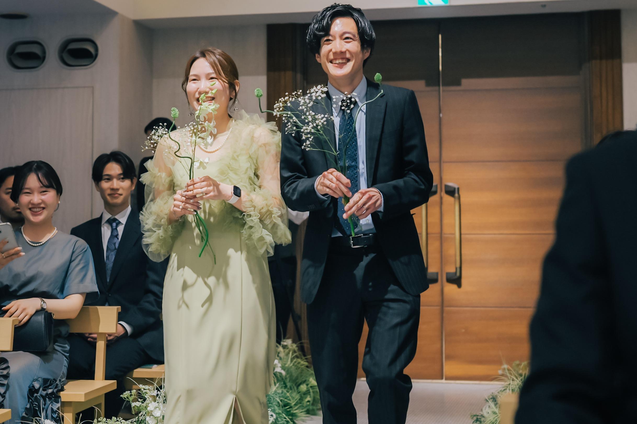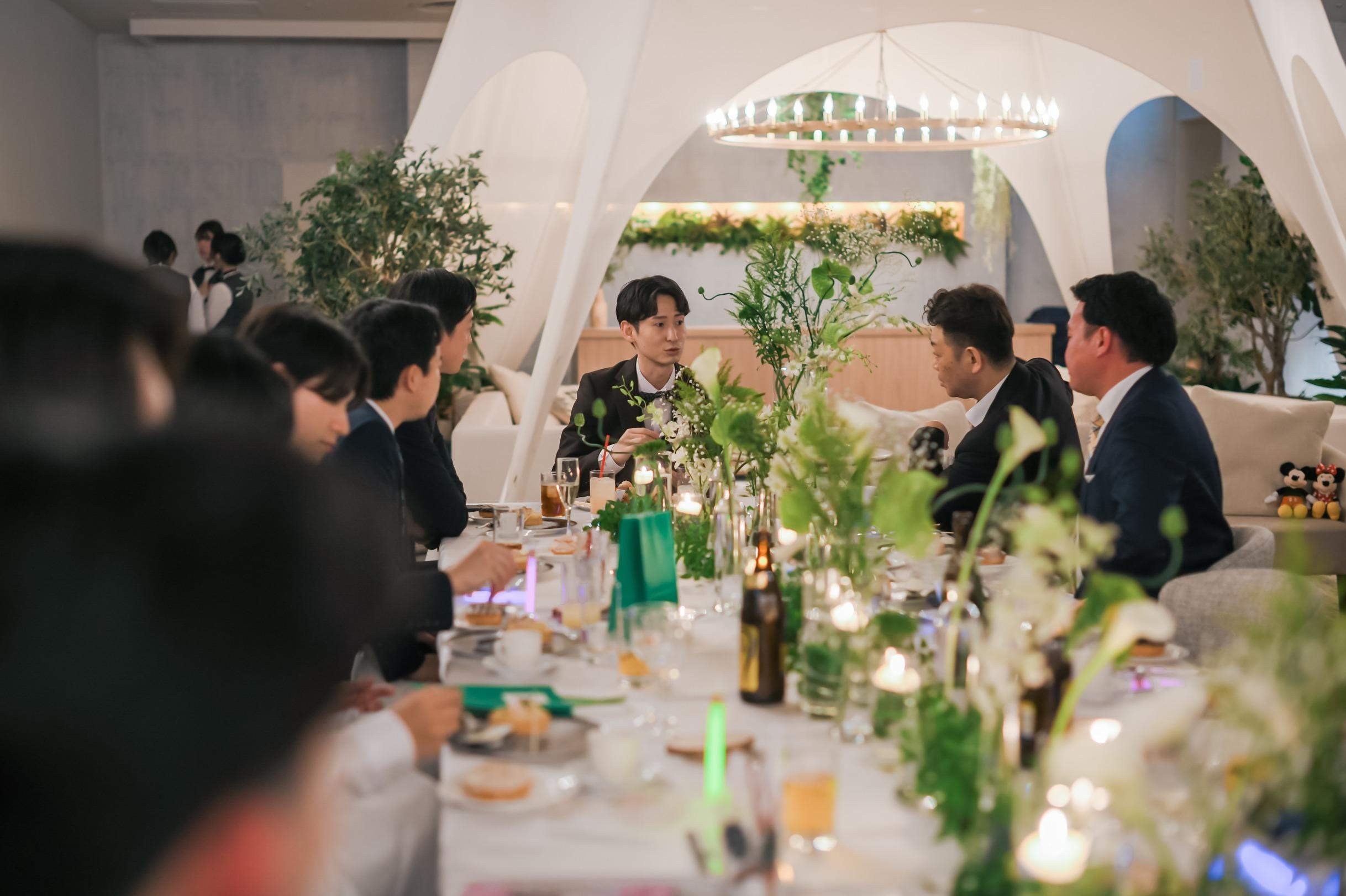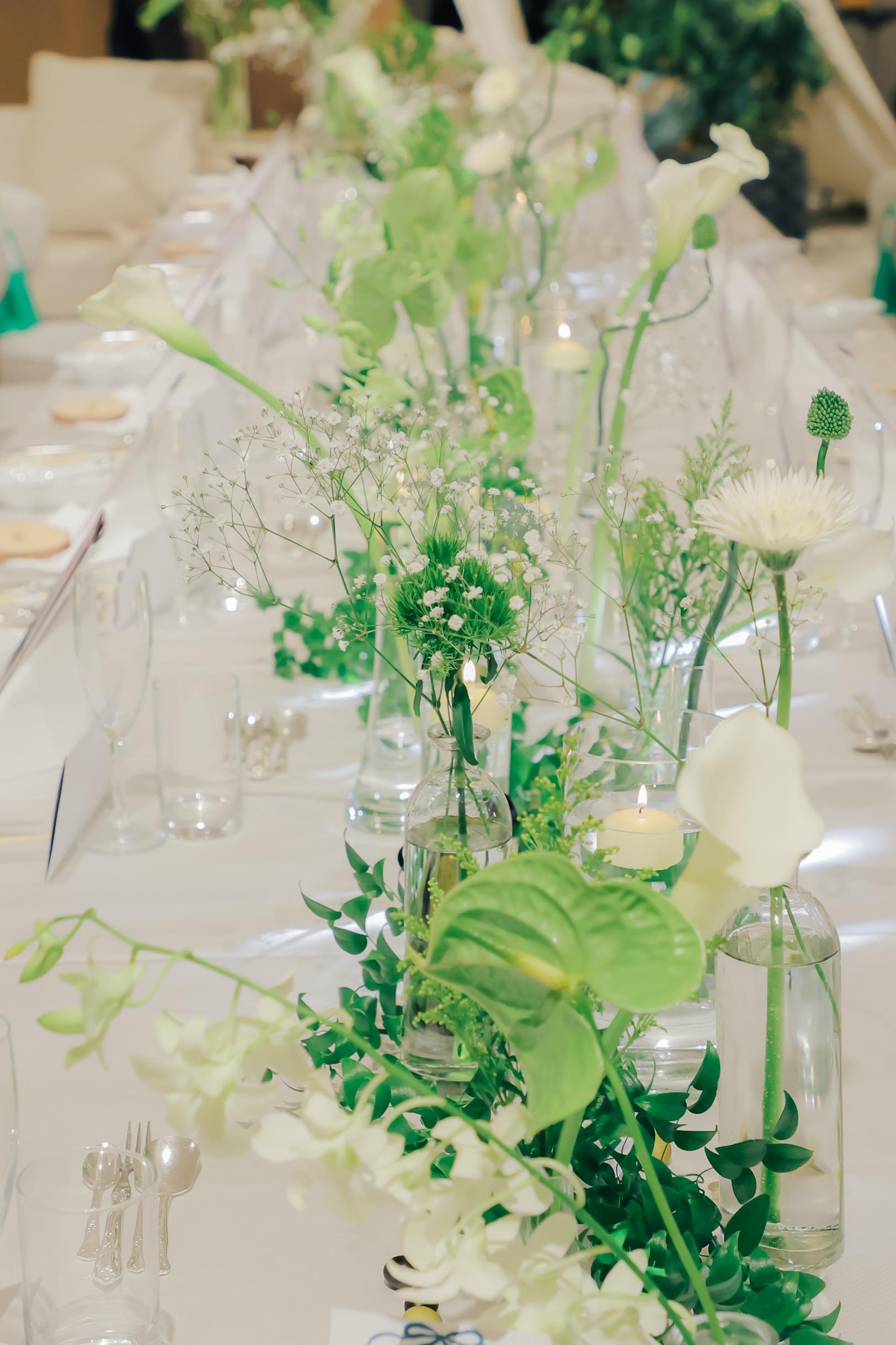 Season:Summer/Party Space:Top of Bay 結婚4年目に式を挙げた私たちのテーマは「花婚式」5年目の「木婚式」への繋がりを表現し、未来に続く家族との絆を強くした一日に