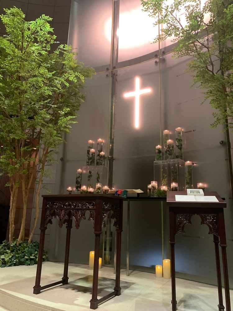 チャペルはコンパクトながら、上品で厳かな印象だった。ライトの使い方も演出のひとつとされているようで、雰囲気のある挙式になりそうだと感じた。