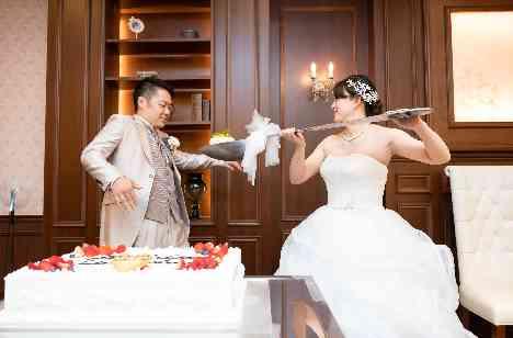新婦様から新郎様へむけたファーストバイトは「一生美味しいお料理を作ります!」といった意味が含まれており、人気の演出となっております。お二人は少しアレンジをして、お顔よりも大きなスプーンに乗っているホールケーキでファーストバイトを行いました!これにはゲストの皆様もビックリされてました!大きなお口でほおばっており、笑顔に溢れました!