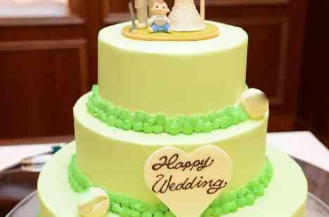 ゴルフ場のグリーンをイメージして、お二人のお名前が入ったゴルフボールと一番上にはご新郎ご新婦様が!! お色味の付いたクリームやピンフラッグをつけてゴルフ場を再現しております! アヴァンセリアン東京にはパティシエがいるので、お二人のご希望のケーキも相談しながらお打ち合わせを進めることもできますよ♪