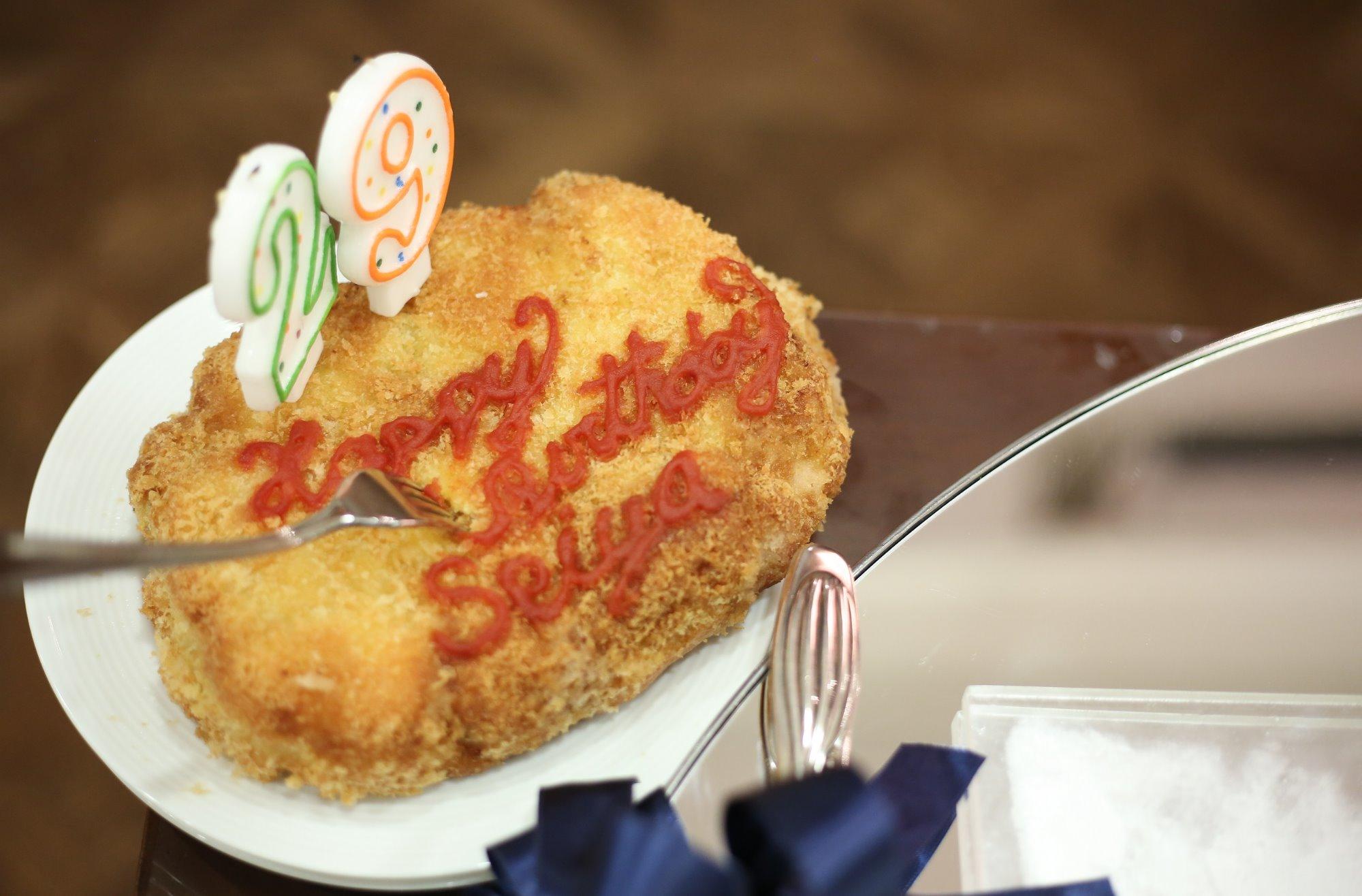 ご結婚式当日はご新郎様のお誕生日♪大好物の『とんかつ』にロウソクを立ててサプライズでお祝いされました。「こんな大きいとんかつ初めて!!」とご新郎様も大喜びだったそうです★
