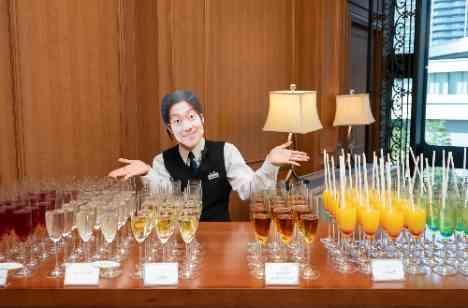挙式が結び披露宴会場へとご案内する際におしゃれなカクテルが並んだウェルカムドリンクをご用意しております。ゲストの皆様にはウェルカムドリンクを楽しんでもらいながらお二人ともお話しやお写真撮影のお時間もご案内することができます♪お二人はスタッフにご新郎様のお面をつけてほしいとご要望があり、お出迎えをするスタッフ総出で着用させていただきました!