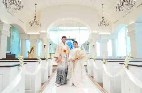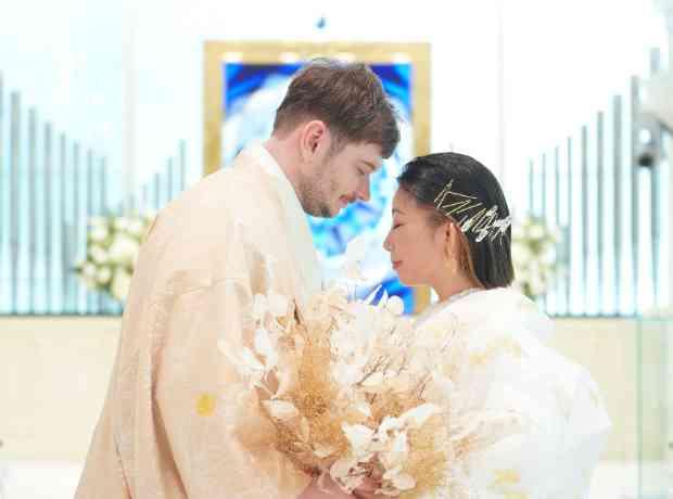 オーガンジーの打掛のような和装に羽をあしらった個性的なデザイン。外国人のご新郎様もとてもお似合いでした。おふたりのベビーちゃんも、お揃いの紋付き袴姿に。天使ちゃんのように可愛らしいお姿でした♡アヴァンセリアン東京のブルーのチャペルに、白の和装が神秘的でうっとり。まるで映画のワンシーンのよう…前夜まで作り直したブーケも流石と思えるセンスの良さでした。