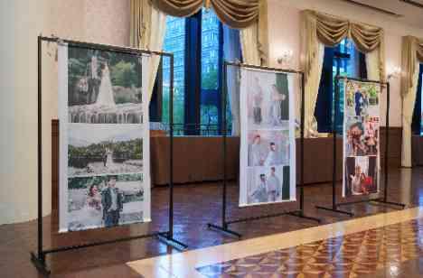 会場中、沢山のタペストリーをラックに設置し、始まる前は巻き付けておき、「乾杯~♪」の合図で、タペストリーを下して、パーティースタート!お料理もゲストが自由に立ち歩いて頂けるよう、着席ブッフェに。展示画像をご覧いただいたり、おふたりの元へお話をしにいったり、おふたりらしい雰囲気のパーティーとなりました。ブッフェといえど、大皿ではなく、銘々小皿にするなど、カジュアルすぎないおしゃれスタイルに!