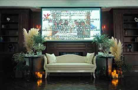 メイン席はソファーに、ゲスト卓は円卓と晩餐会のような流しテーブルを組み合わせ配置した珍しいセッティングに。何度も打ち合わせた装花もくすみ系の色合いで、高級感ある素敵な大人モードな雰囲気が、木目の会場に抜群に映えました。ゲストの皆様にも好評で、喜んでお持ち帰りいただきました。自由度の高いアヴァンセリアン東京ならではのセッティングでした。