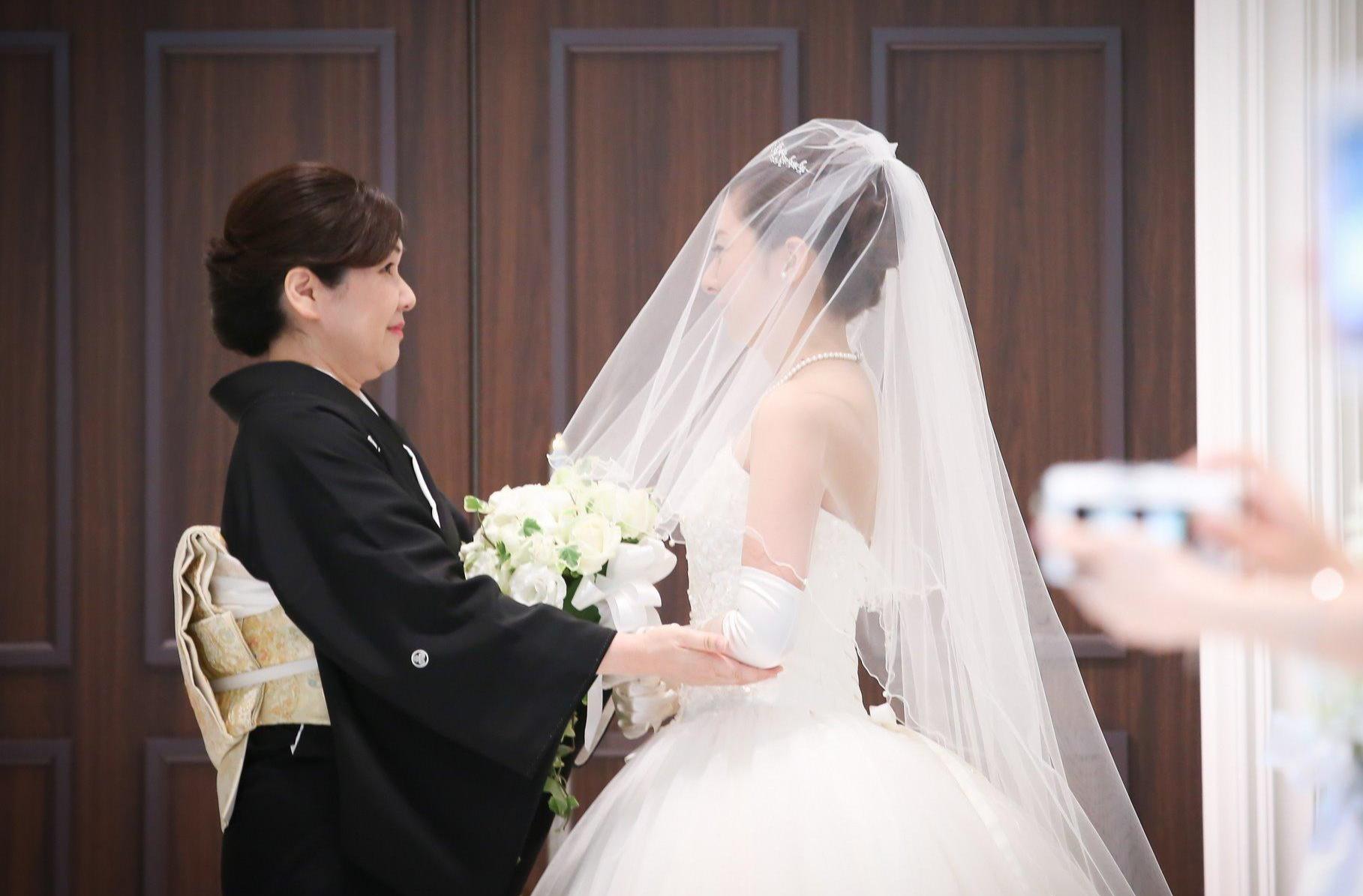 大きな扉の前で母からのベールダウンは感謝と寂しさで言葉にならない美しいシーンとなりました。母の優しい瞳に見つめられ、特別な想いで挙式を迎えることができます。