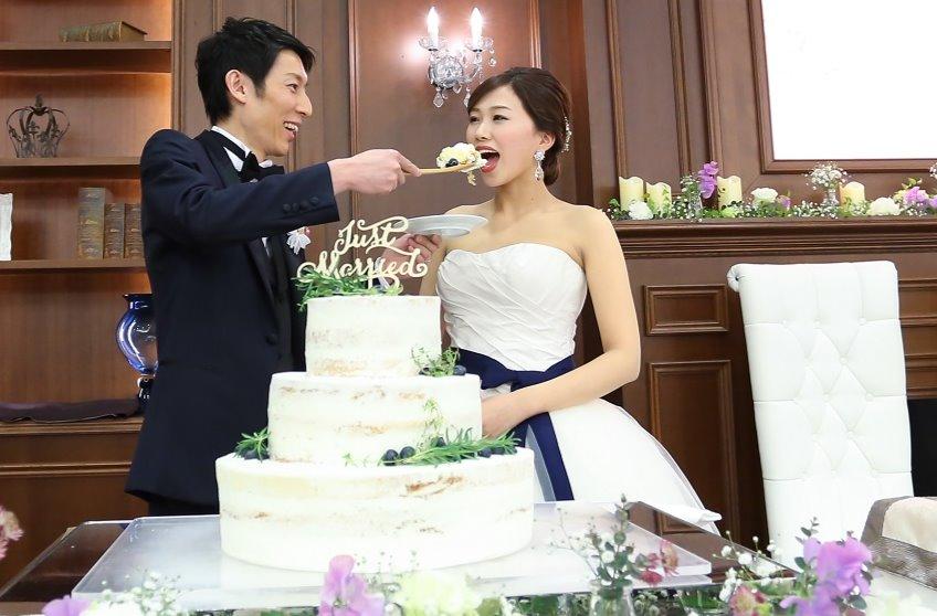 ふたりのおしゃれな雰囲気に合わせてナチュラルテイストのケーキを用意!ファーストバイトはもちろん、友人代表も出てきて、幸せのおすす分け「あ〜ん♪」を楽しんでもらいました!
