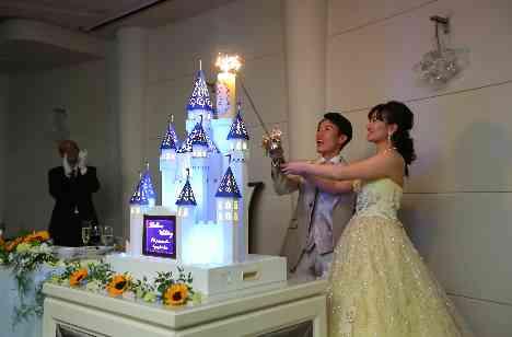 シンデレラ城のような可愛らしいお城デザインのキャンドル。点火と同時にお城が煌めきます♪まるで王子様とお姫様のようなおふたりにゲストからの拍手が沸き起こりました!淡イエローのドレスもとってもお似合いです☆