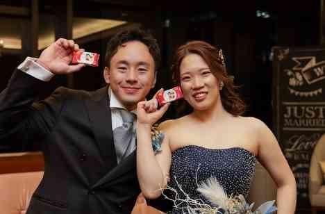 お帰り際にゲストへお渡しするプチギフトはビスコをお配りしました!『ビスコ』の部分をお二人の苗字に変えてお二人のお顔付で皆様喜ばれておりました(^^) プチギフトもお二人の好きなお菓子や、プチ雑貨、出身地の名産品、夏はラムネなどのドリンク、冬はホッカイロなど季節に合わせて選んでみるのもいいかもしれませんね!