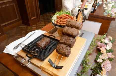 乾杯のご発声後に登場したのはなんと!シュラスコ入刀! そして、キャンプには欠かせないシャウエッセンもしっかり準備しました! ケーキではなく、お肉の1ブロックをお二人の共同作業として、完成してもらい、好きな大きさにカットして、ファーストバイトを行いました! あまりみない演出にゲストの皆様も大興奮されておりました!