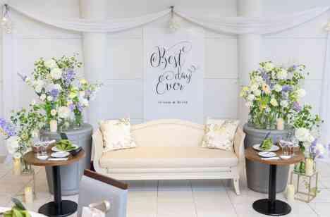 ご見学にご来館いただいた時からご希望だったソファメイン♪まわりはグリーンと白、紫で華やかな装飾となりました! メインテーブルではなくソファにすることで、お二人のタキシードとドレス姿が足先まで見えることやゲストの皆様との距離もぐっと近づくので、カジュアルな結婚式をご検討されているお客様におすすめです!