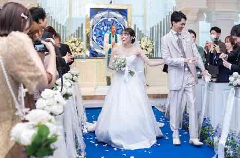 お二人は牧師先生がいる教会式でお式を執り行いました! バージンロードはブルーにし白いドレスがとても引き立っておりました(^^) 退場時はゲストの皆様からの祝福のフラワーシャワーで華やかに♪ フラワーシャワーがあるとお写真映えするので、プランナーからもおすすめです! ぜひ参考にしてみてください!