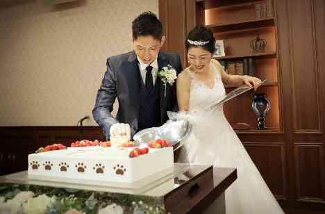 披露宴の中で取り入れられたセレモニーのひとつとして、ケーキ入刀が挙げられます。おふたりはケーキの細部までにこだわり、猫モチーフのケーキに仕上げました。当日は会場内を沸かすと共にとても素敵なシャッターチャンスのお時間にもなりました。