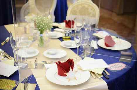 「このご時世だからこそ、笑って過ごせる結婚式にしたい!」ゲストを思いやるお気持ちが強いおふたり。披露宴会場内のゲストが座るテーブルには透明のアクリル板をご用意して、飛沫防止・対策もしっかりと行いました!