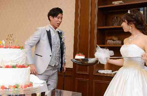 新婦様から新郎様へむけたファーストバイトは「一生美味しいお料理を作ります!」といった意味が含まれており、定番の演出。お二人は少しアレンジをして、顔よりも大きなスプーンにホールケーキがすでに用意されている!これにはゲストもビックリ。笑顔に溢れました!