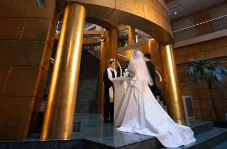 天井高42mある開放感溢れるチャペルの中で執り行うキリスト教式。 神父の前で永遠の愛を誓うことで厳かさや温かさに包まれます。 聖書の言葉や賛美歌、祈りがゲスト全員の胸に響きわたり、人生の節目が深く心に刻まれます。 世代を超えて受け継がれる伝統が、おふたりの誓いを普遍的な価値へと高めてくれます。