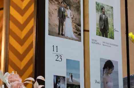 想い出の前撮りのお写真を、世界にひとつだけのタペストリーに。 素敵なデザインと柔らかな色合いが、おふたりの写真をより印象的に引き立てています。 自然の中で撮影された表情や仕草からは、肩やひじを張らない等身大の幸せが伝わり、思わずゲストが写真を撮りたくなり、結婚式への期待感を高めてくれる魅力があります。