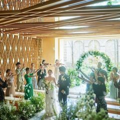 【選べる2つの挙式スペース】美しい20万粒のスワロフスキーが煌めくクリスタルチャペルと、自然を感じる檜の香り漂う和モダンな挙式空間からお好みに合わせてお選びください。華やかなアフターセレモニーも人気。