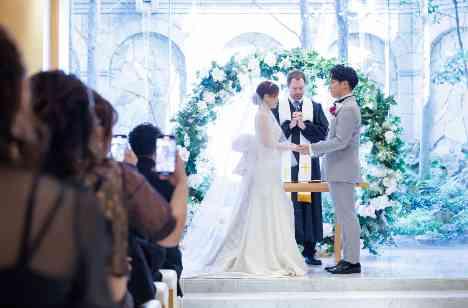 新婦様が当初ご希望されていた「森の中での結婚式」。 雨や風の影響を受けずに叶えられるチャペルがデュクラス大阪の“IZUMO”です。 やわらかい日差しもおふたりの祝宴をお祝いするかのように神秘的に差し込みました。 ゲストの皆様との距離も非常に近く、アットホームな雰囲気の中にも厳かな式が叶います。