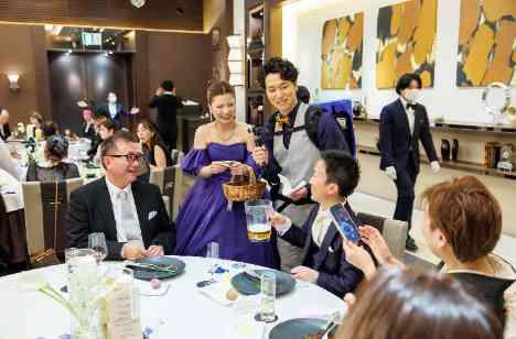 御希望のあった演出のひとつ「ビールサーブ」。日ごろの感謝を込めてゲストテーブル1卓1卓に丁寧に且つ、楽しみながら注がれました。ゲストとの距離がさらに縮まる演出のひとつです。さらに「ドレス当てクイズ」では事前にお配りしたサイリウムに当たりを仕込み、豪華景品を直接プレゼント♪ そして、景品をゲットしたゲストの皆様とも記念写真をパシャリ♪