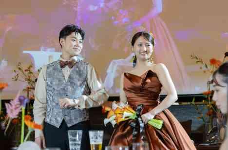 衣裳は会場にマッチしたブラウンコーデでお色直し♪ 新婦様のブラウンのカラードレスに併せて新郎様もベスト&ネクタイをブラウンに統一!おふたり揃って雰囲気がガラリと変化しゲストの皆様も大喜び! ドレスの色当てゲームも行い、抽選により当選者にはおふたりからスターバックスのグッズを贈呈♪ 演出も盛りだくさんで、笑いの絶えないお時間となりました!