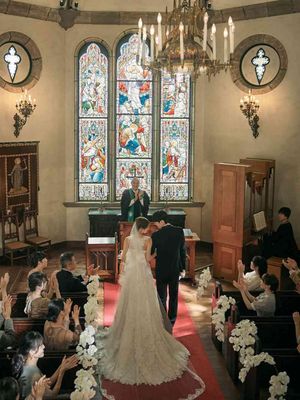 英国の教会で実際に使われていたステンドグラスから差し込む敬虔な光に包まれるアンティークに彩られた重厚なチャペルは、お二人の永遠の愛を誓うのにふさわしい空間です。