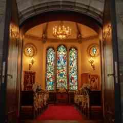 【全天候型のチャペル&神殿】美しく輝くステンドグラスと赤のバージンロードが魅力の独立型チャペルは、全天候なので挙式後の演出も叶う。ホテル内とは思えない本格神殿も人気。入場体験でその魅力を堪能して