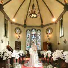 【全天候型の独立型チャペル】美しく輝くステンドグラスと赤のバージンロードが魅力の独立型チャペル。全天候のチャペル前広場で、挙式後はフラワーシャワーやバルーンリリースなどゲストからの温かい祝福を。