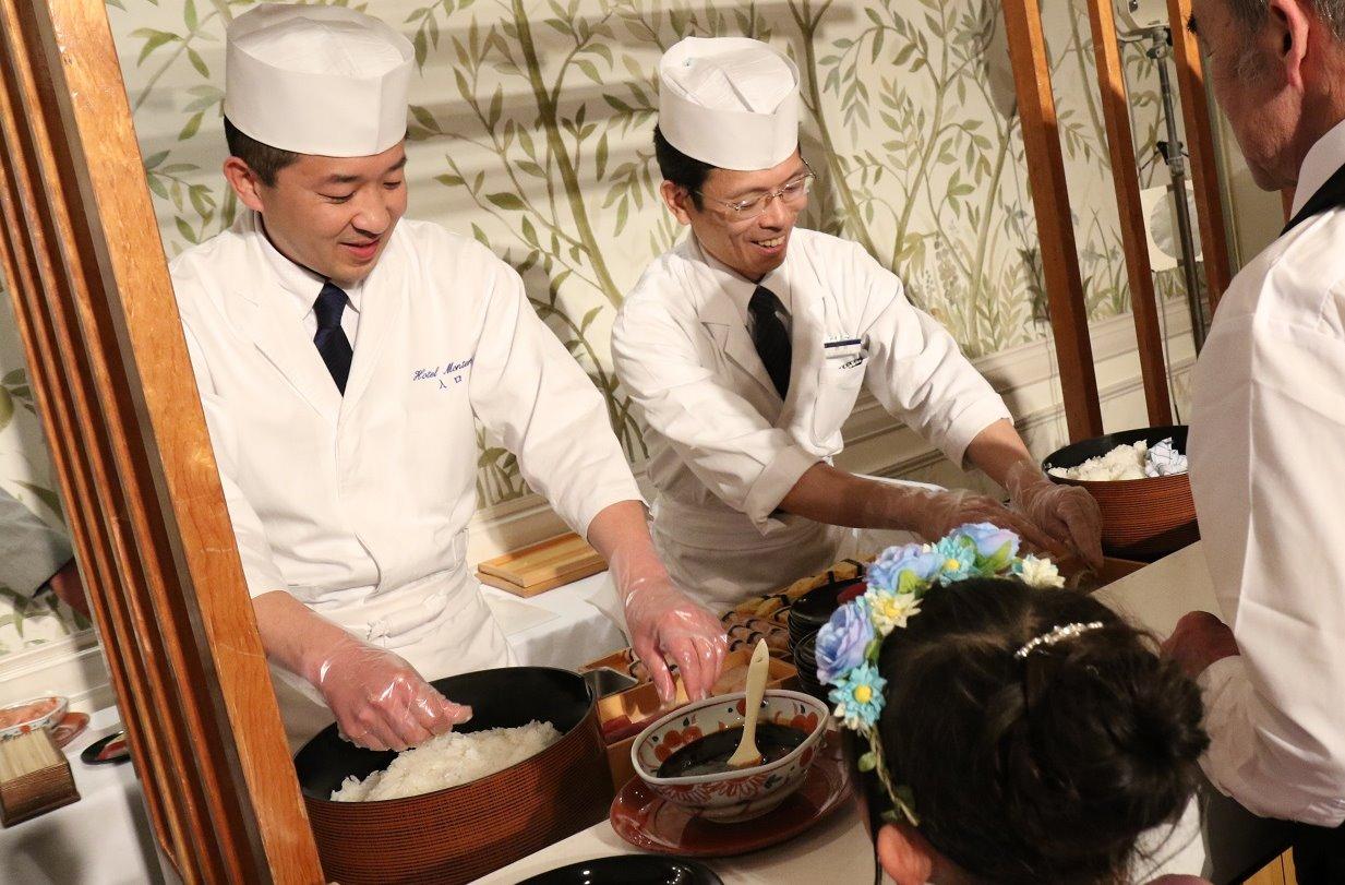 皆に笑ってほしいという想いで演出を考えました。ファーストバイトは2人共ビックスプーン、お色直し入場はポーズカード持ち込みでフォトラウンド、最後にはわがままを聞いてもらい寿司屋台を出してもらいました。ちなみにBGMはゲストの方々の青春時代の曲を・・・と懐メロを中心にしました。