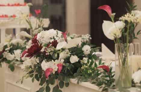 高砂・ゲストテーブルともに、白をベースに差し色でワインレッド系を入れた装花を作っていただきました。 お花以外にもキャンドルやミラーを使ったり、花材を変えることで当初の予算から金額を上げず、最大限華やかになるよう工夫したことがポイントです。どれだけお願い書を用意して入念に準備していても、当日にしか確認できないため不安もありましたが、思っていた通りの仕上がりで本当に満足しています!