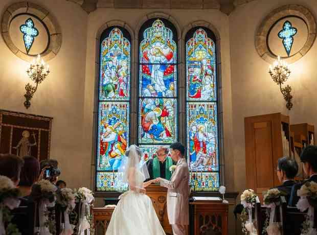 ステンドグラスと赤いバージンロードが気に入ったチャペルで、王道の教会式を執り行いました。ご親族様やご友人様に見守られながら、素敵な時間を過ごすことが出来ました。珍しい演出などは取り入れず、しっかりと親御様に感謝の気持ちを伝えみんなの記憶に残るような素敵な時間を過ごしていただく事をイメージして打合せしました。