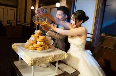 アルバイト時代にご一緒に働いていた場所にちなんでドーナツタワーをご準備されました。ウエディングケーキでは無い演出にゲストの方も一緒にとても盛り上がる演出となりました。ケーキに入刀ではなくソースドリップにして皆様に見守られながらソースをかけて完成ドーナツセレモニー★みんなにお写真もたくさん撮って頂きとても素敵な時間になりました。