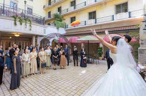 挙式後のウェルカムパーティーはゲスト全員参加で盛り上がるようにドーナツトスを参加者全員の方と一緒にしました。 おふたりにちなんだ演出ということもあり挙式後の緊張もほぐれ、とっても盛り上がる楽しい時間になりました。 おふたりらしさも伝わり、ゲストも参加できる楽しい演出でした!ぜひ皆さまもおふたりらしいオリジナル演出をしてみてはいかがでしょうか。