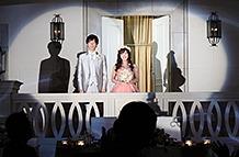 会場に巨大な3面スクリーンがあり、映像演出のバリエーションも豊富で、シーンに合わせて様々なムードを演出。お色直し後の入場は、映像が流れてバルコニーにゲストの視線が集まったところで扉が開き、ふたりが登場するサプライズ!両親への花束贈呈シーンまで盛り込まれたエンディングビデオで、感動の余韻に包まれた。
