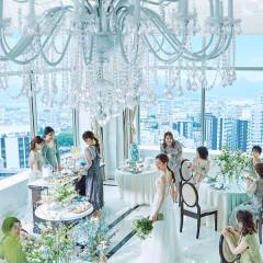 【地上100m高層階の披露宴】乾杯と共にカーテンが開くと都心のビル群と青い空が広がりゲストから歓声も。ガーデンパーティ体験やバルコニー演出&大好評のプロジェクションマッピングも模擬披露宴でチェック!