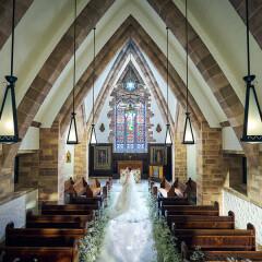 【全天候&独立型】気候や天候の心配をせず挙式からアフターセレモニーまでをおこなえるウエディングの為の空間。色彩豊かなステンドグラスがバージンロードに彩りを添える様子は、訪れる人全てを魅了するほど幻想的