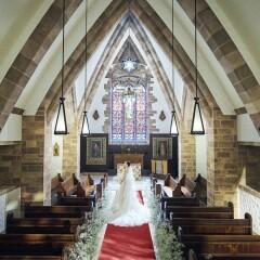 【全天候&独立型】気候や天候の心配をせず挙式からアフターセレモニーまでをおこなえるウエディングの為の空間。色彩豊かなステンドグラスがバージンロードに彩りを添える様子は、訪れる人全てを魅了するほど幻想的