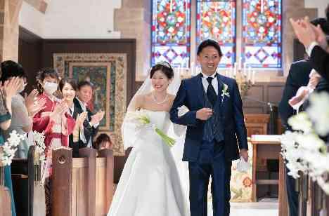 真っ白な大理石のバージンロードにステンドグラスの輝きが映り込む、幻想的な光景が印象に残る独立型のチャペル。「挙式は王道の正統派に!」との希望から教会式を選び、聖歌隊の歌声やパイプオルガンやバイオリンの生演奏が彩るセレモニーを叶えた。アフターセレモニーではコスメブーケ&サッカーボールトスと新郎新婦から幸せをおすそわけ。