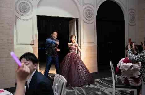 ドレスの色当てクイズを兼ねたお色直しの再入場は、ゲスト全員にペンライトを配って一緒にダンスを楽しむ参加型イベントに!続いて各卓ラウンドで記念撮影も楽しみ、ゲスト全員との触れ合いを満喫した。「ゲストに満足していただけるよう、お茶漬けビュッフェも取り入れました。お漬物がお酒のあてになったと、とても喜ばれました」