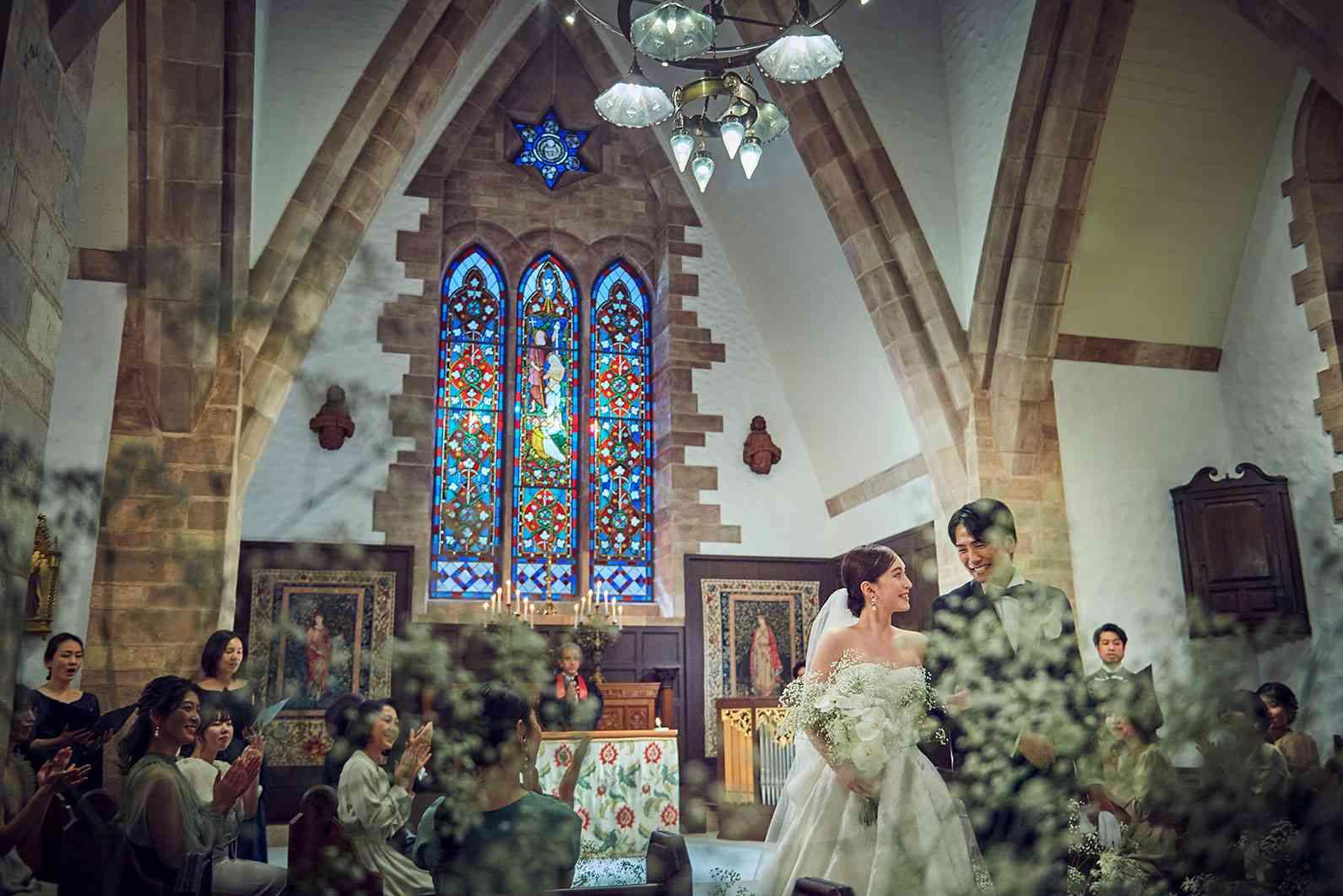 ご成約特典で、お二人の好みや結婚式のテーマに合わせてバージンロードを白、赤、青から選んでいただくことができます。のバージンロードもステンドグラスとのコントラストが美しく、花嫁を美しく際立てます。