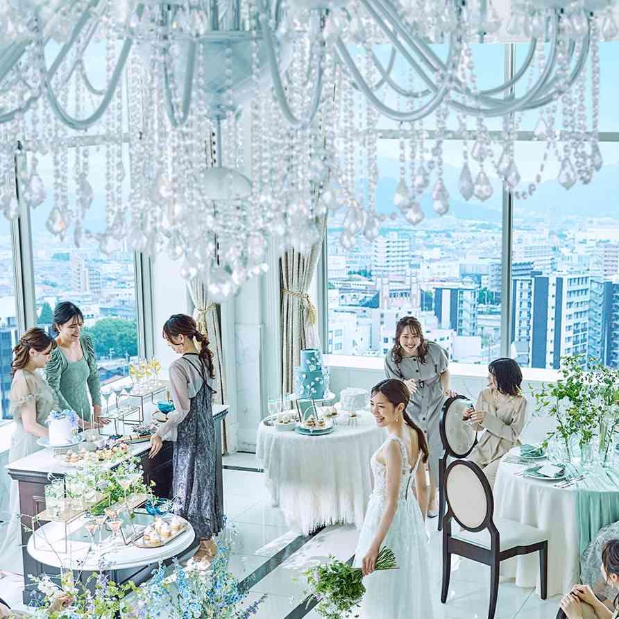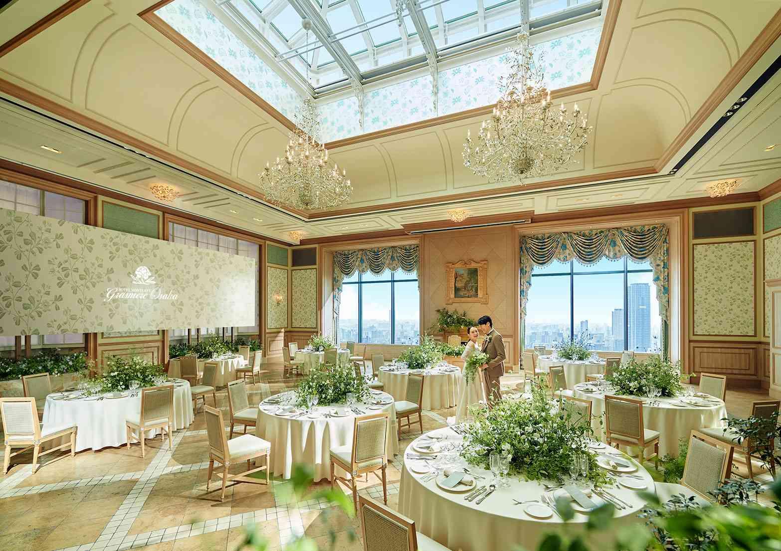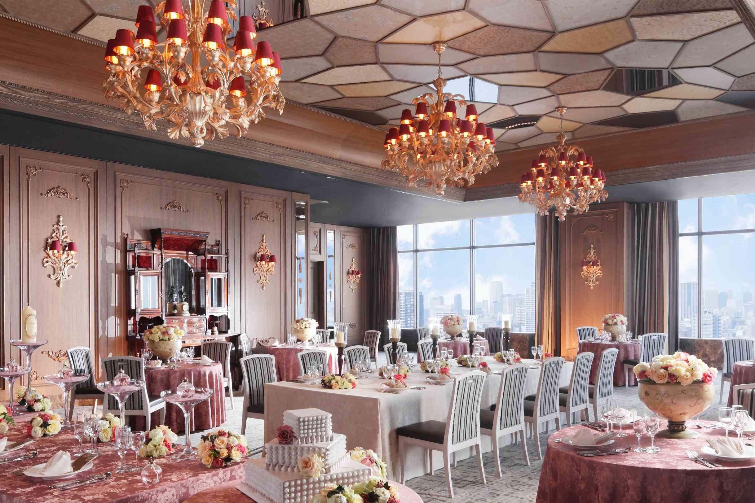 英国湖水地方【ウィンダミア湖】をイメージしたメインバンケット。スワロフスキーのシャンデリアが輝き、地上100mからの絶景を望む。気品があり上質感のある人気会場(着席70~140名)