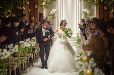 お二人からのご要望でオープン初日にご結婚式を挙げられるお話しを司会よりお伝えすると歓声と期待を込めた拍手が鳴り響きました。実はご新郎様…お打ち合わせの時から担当プランナーへ「新婦のお父様とハグをしていいですか!」とご相談をいただいておりました。リハーサル時は握手を交わしましたが挙式本番では大切な娘さんを任せてください!と男同士のハグをしました♪隣で嬉しそうに微笑むご新婦様のお姿もとても素敵でした!