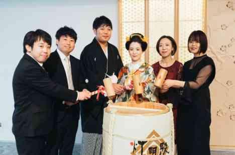 演出のひとつとして取り入れられたのは「鏡開き」。 ゲストの皆様にも「いち、にの、よいしょ~!」と掛け声でご参加いただき、新郎新婦とご両親が息を合わせて力強く開かれました。そのお酒は、姉妹店「博多百年蔵」で心を込めてつくった日本酒。会場に広がる華やかな雰囲気とともに、感謝の想いを皆様にお届けしました。