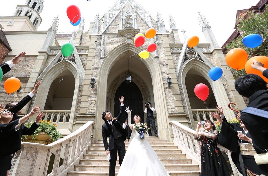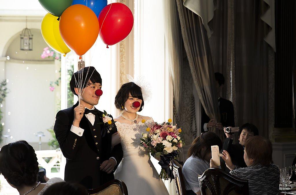 お二人の披露宴は明るく楽しく「CIRCUS WEDDING」がテーマではありましたが、挙式は教会式をお選びになられ、挙式は厳かに、厳粛に、メリハリをつけて行いました。 ゲストの方々の暖かい拍手に包まれながら、お二人のとても幸せそうな表情が印象的でした。 挙式後はサーカスのイメージで、POPカラーのバルーンでバルーンリリースを行いました!
