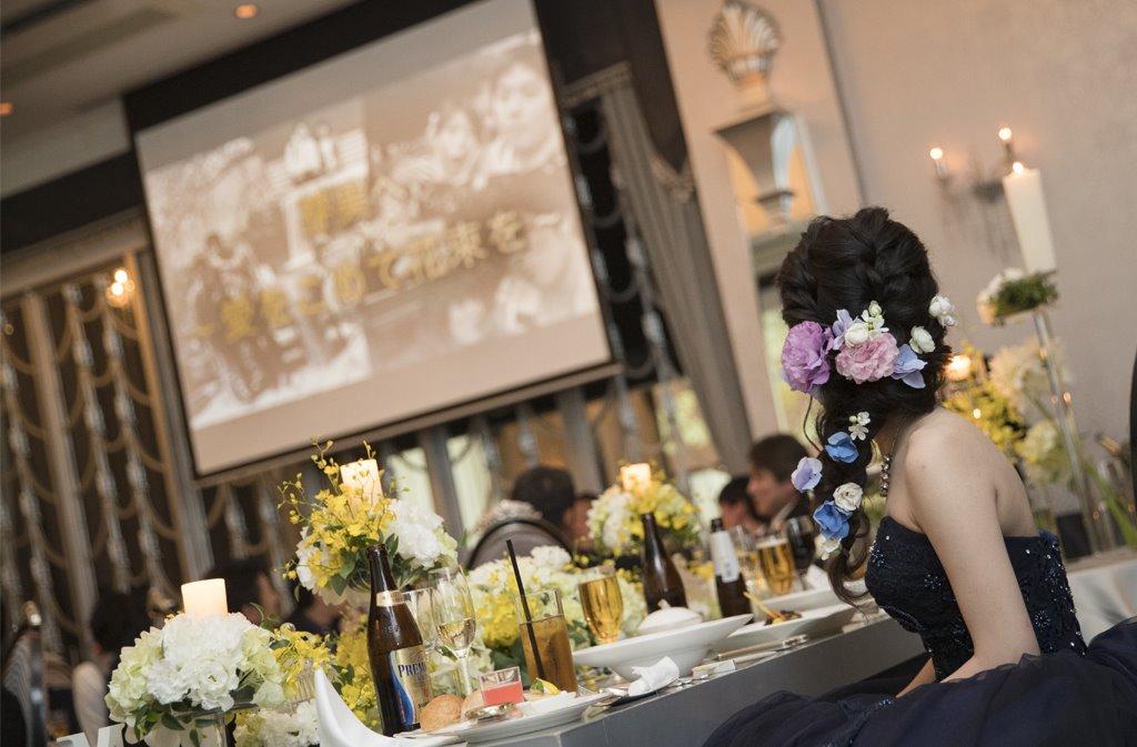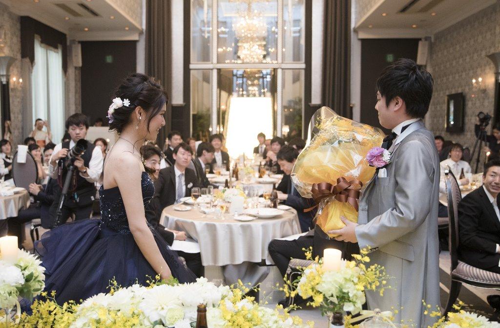 サプライズムービーをご用意してくださり、その中では新郎様新婦様の思い出の地を巡りながら黄色の花を一輪一輪集めていくというストーリー。そしてムービー内で花束が完成した後、新郎様から大好きな新婦様へ大きなヒマワリの花束をプレゼント。ヒマワリにした理由を「黄色が好きだと言っていたから」と照れた表情でお話してくださいました。新婦様も涙を流し感動され、ハートフルな披露宴となりました。