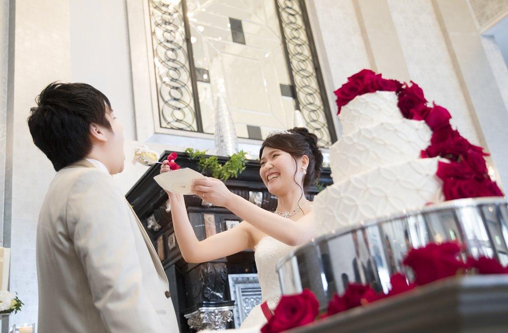 新婦様一番のこだわりポイントと言っても過言ではないウエディングケーキ!とても上品かつシンプルに、赤いバラとアラザンのみで装飾を行いました。 ウエディングケーキが披露宴会場に登場した途端、会場からは完成が!! お二人はもちろんの事、ゲストの皆様にも印象深いウエディングケーキだったのではないでしょうか。
