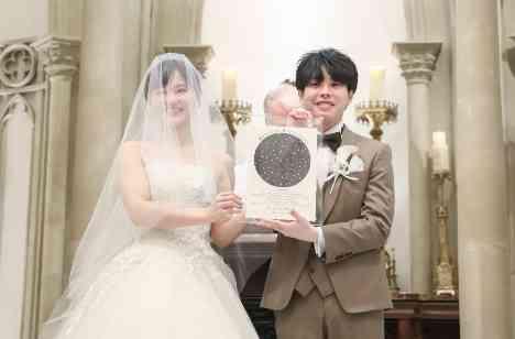 結婚証明書はご婚礼当日にグラストニアから見た夜空を再現したもので、受付でゲスト様に星のシールを張っていただき、挙式で完成・披露を行いました。【きらきら星】の生演奏で、夜空を演出。結婚証明書はお2人の愛の証。二人だけではなく、大切なゲスト様と一緒に作り上げたからこその涙溢れる感動のシーンとなりました。