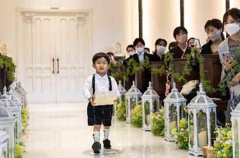 新郎様の甥御様をリングボーイに任命!堂々と笑顔で指輪を運んでくれた甥御様は、皆様のアイドルでした(*^^*)とっても温かい笑顔と拍手にチャペル全体が包まれました! 甥御様が運んでくれた指輪が乗っているリングピローはお母様が手作りされたものです♪ とても素敵な刺繍が入っていて、お2人にぴったりのリングピローでした!