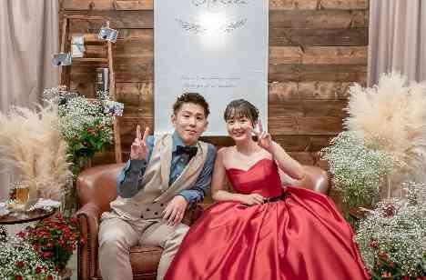 会場の装花は沢山話し合い色味や雰囲気を決めていきました。お好きなパンパスグラスやかすみ草でいっぱいにして、赤色のカラードレスに合わせて5月のお花をアクセントとして入れました。 またテーブルコーディネートも手作りアイテムたちをご用意。前撮りの素敵なお写真をThanksカードにされ、ゲストの方々もお喜び頂けました(*^^*)