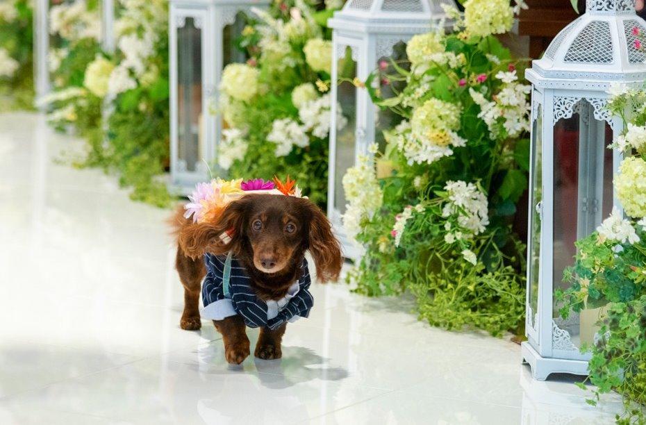 挙式当日、順調にリハーサルも終えていざ本番へ。入場後に誓いの言葉を誓う為に宣誓書をとって、ゲストの前で読み上げる際に… 新郎、宣誓書を落としてしまい、会場が笑いの渦に(笑) 一世一代の舞台でやっちゃいました! そして、リングドッグの紫音もリハーサルでは真っ直ぐ歩けたのに、本番ではゲストのワンちゃんへ挨拶周りに…(笑)終始、笑顔に包まれた挙式でした。